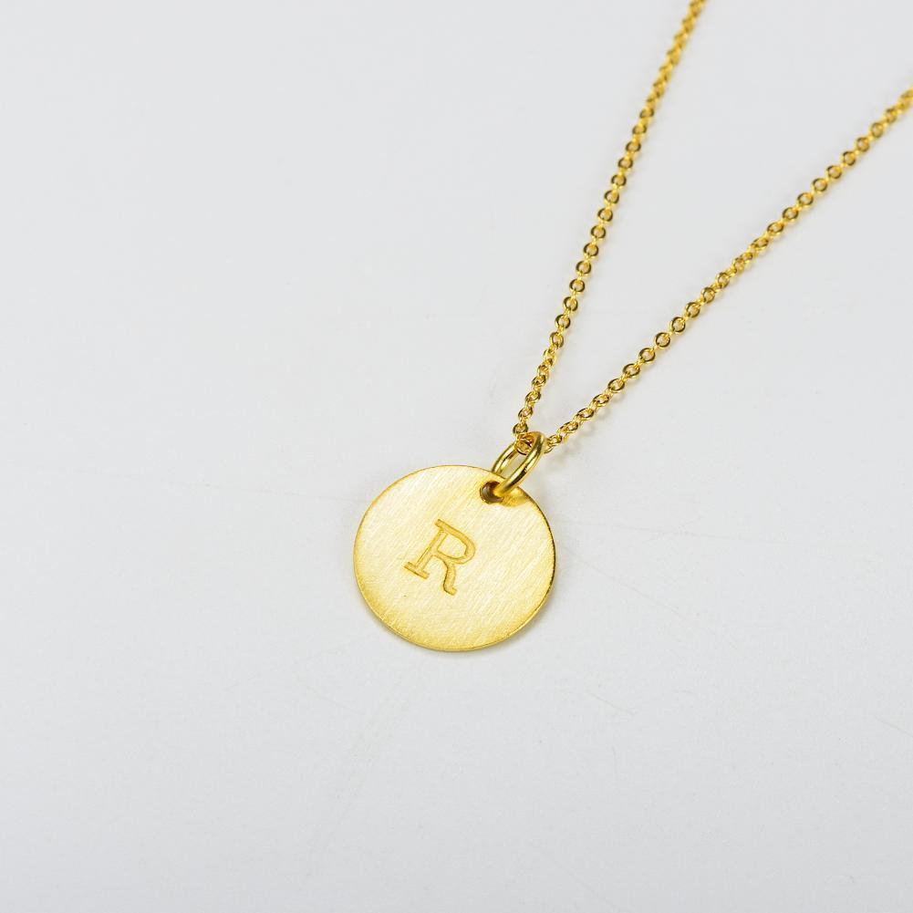 14K Yellow Gold Script Disc Initial Necklace Round Letter 'R' Pendant in 925 Sterling Siver 18'