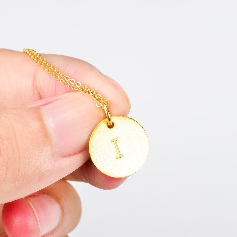 14K Yellow Gold Script Disc Initial Necklace Round Letter 'I' Pendant in 925 Sterling Siver 18'